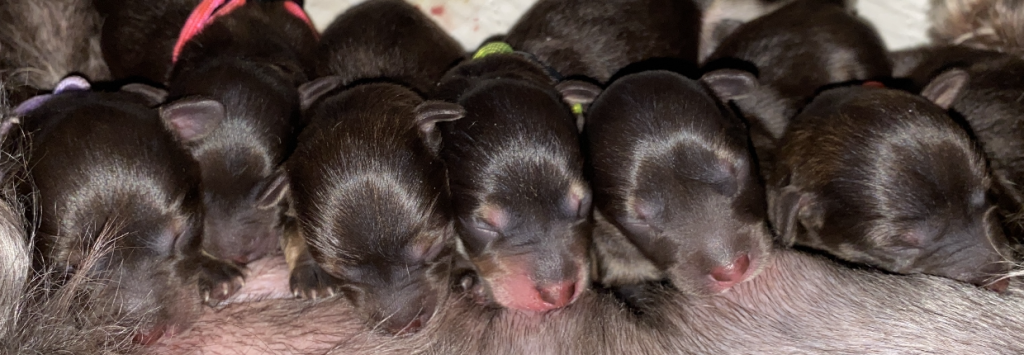 At 4 weeks, we begin litter-box potty training to keep their area clean and make home transitions easier. Grooming starts at 2 weeks so they learn early that it’s a positive experience. Puppies receive a parvo booster, 5-in-1 vaccine, regular deworming, and tail/dew claw docking by our local vet. We do not crop ears.